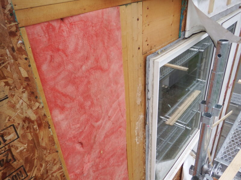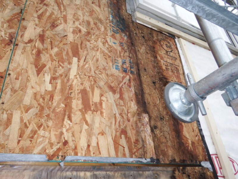 傷んでいた、外壁下地材、構造用合板(OSB)、透湿シート等を撤去し